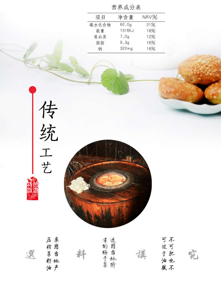 - 配料表: 面粉、猪肉丁、梅干菜、菜籽油、芝麻、鸡精、白砂糖